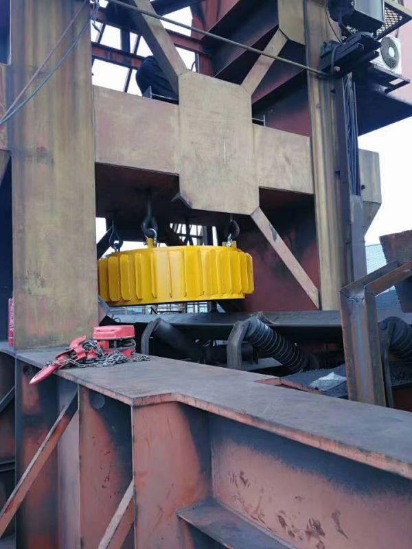 悬挂式永磁除铁器安装指南安装位置选择:(1)空间宽敞,便于除铁器调动和吊装(2)便于除铁器缷铁和清除(3)便于轨道安装和固定(4)优选在输料机头传动滚筒抛料顶点